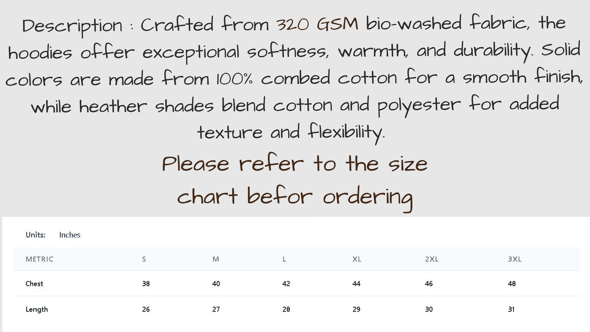 Every piece is custom made for the customer, all of them are 180 - 220 gsm or above, wash before wearing, wash and iron INSIDE-OUT ONLY.